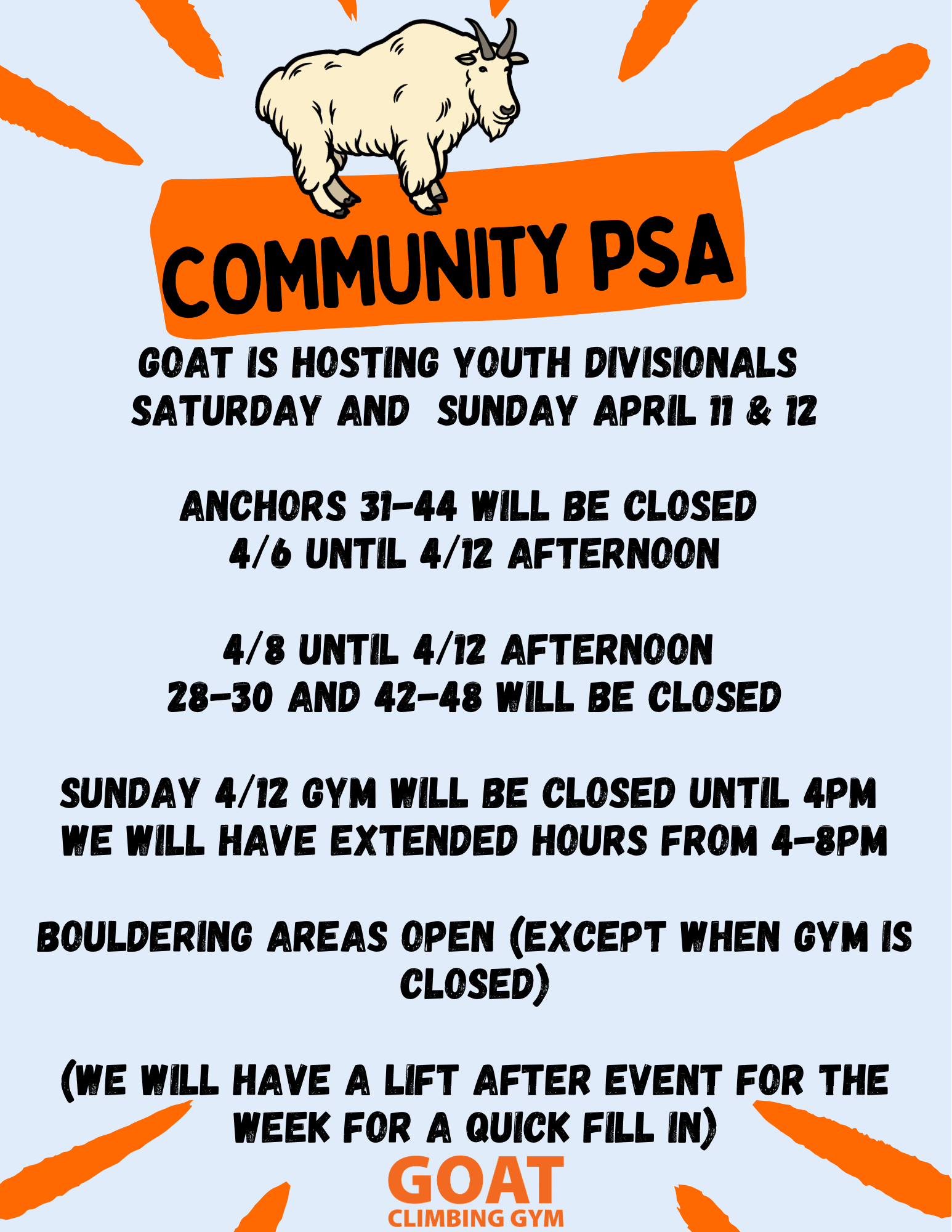 GOAT Climbing Gym is a friendly & inviting space for both kids & adults, with roped climbing options on state-of-the-art walls ranging from 25-60 ft high! We are a walk-in gym facility, with many opportunities to work with our experienced & dedicated instructors on an appointment basis at every level. It doesn’t stop there – GOAT is proud to host your event, from birthday parties to scout trips, corporate work events, school trips, camps, bar/bat mitzvah, competitions & group climbing events!
